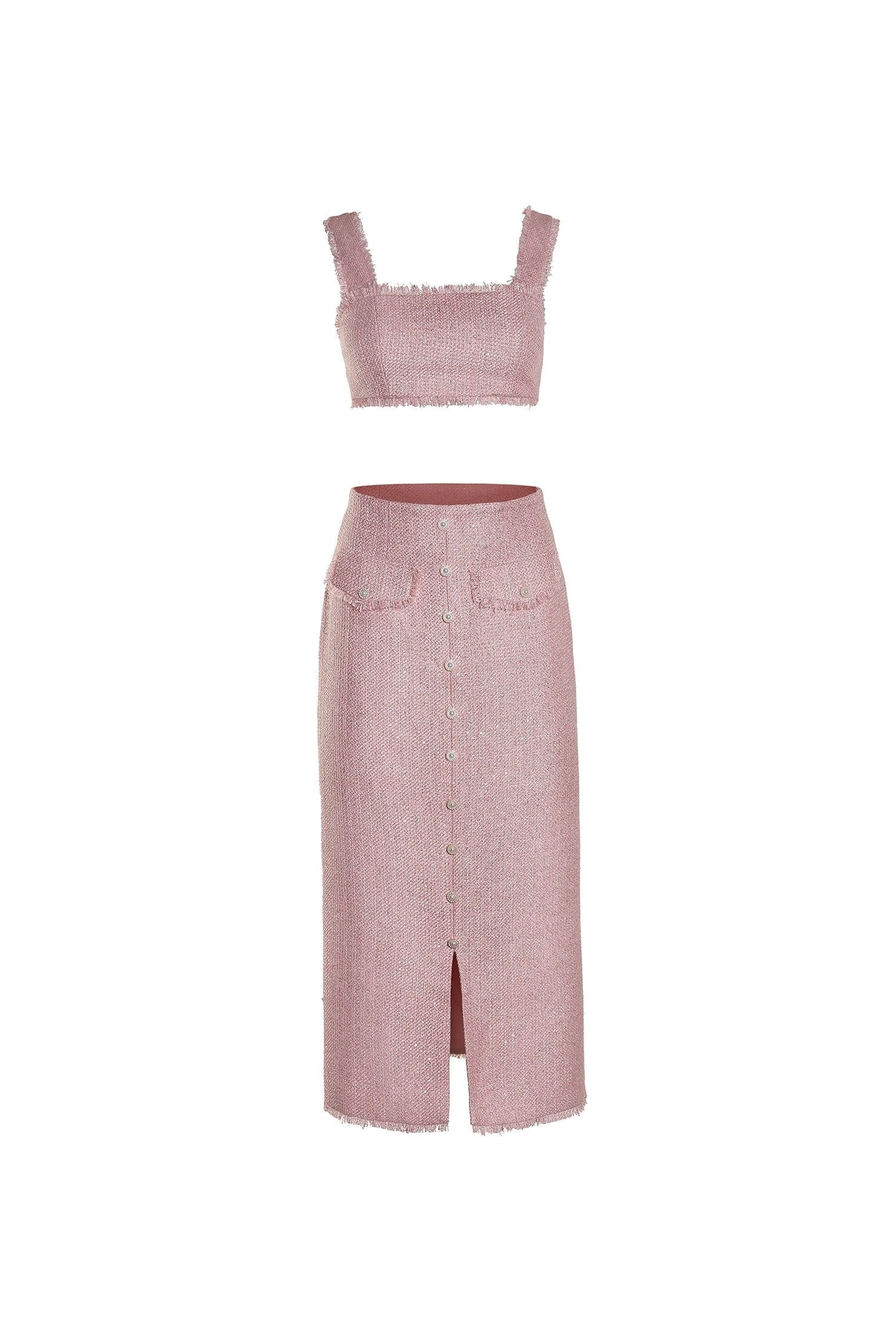 The Amina Set is the epitome of chic, this stunning set is made from shimmering pink tweed fabric and features pearl buttons and frayed edging. Mix & match with your other outfits or wear as the complete set for a feminine, pretty-in-pink yet sophisticated look.Â
