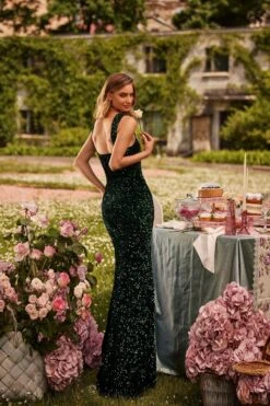 Matte satin fabric, minimal stretch, boning in bodice, padded cups, halter neckline, mermaid silhouette, side slit, zip back.