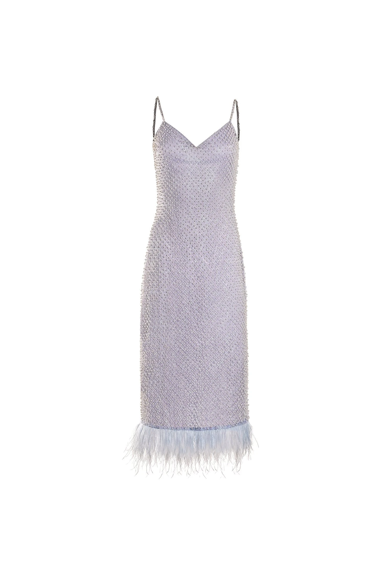 Take a glamourous approach to your look with the Carlotta Dress. Rendered from a delicate beaded glitter fabric with a feather trim to catch all the attention. This midi dress features a daring low back with a straight silhouette and dainty shoulder sleeves. Remember every moment in the Carlotta Dress.
