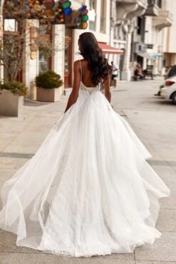 Simple & modern, the Katelyn Gown features a v-neckline, low back & mermaid fit with a train. This gown is perfect for our brides who are looking for a subtle, yet sophisticated style for their wedding day.
