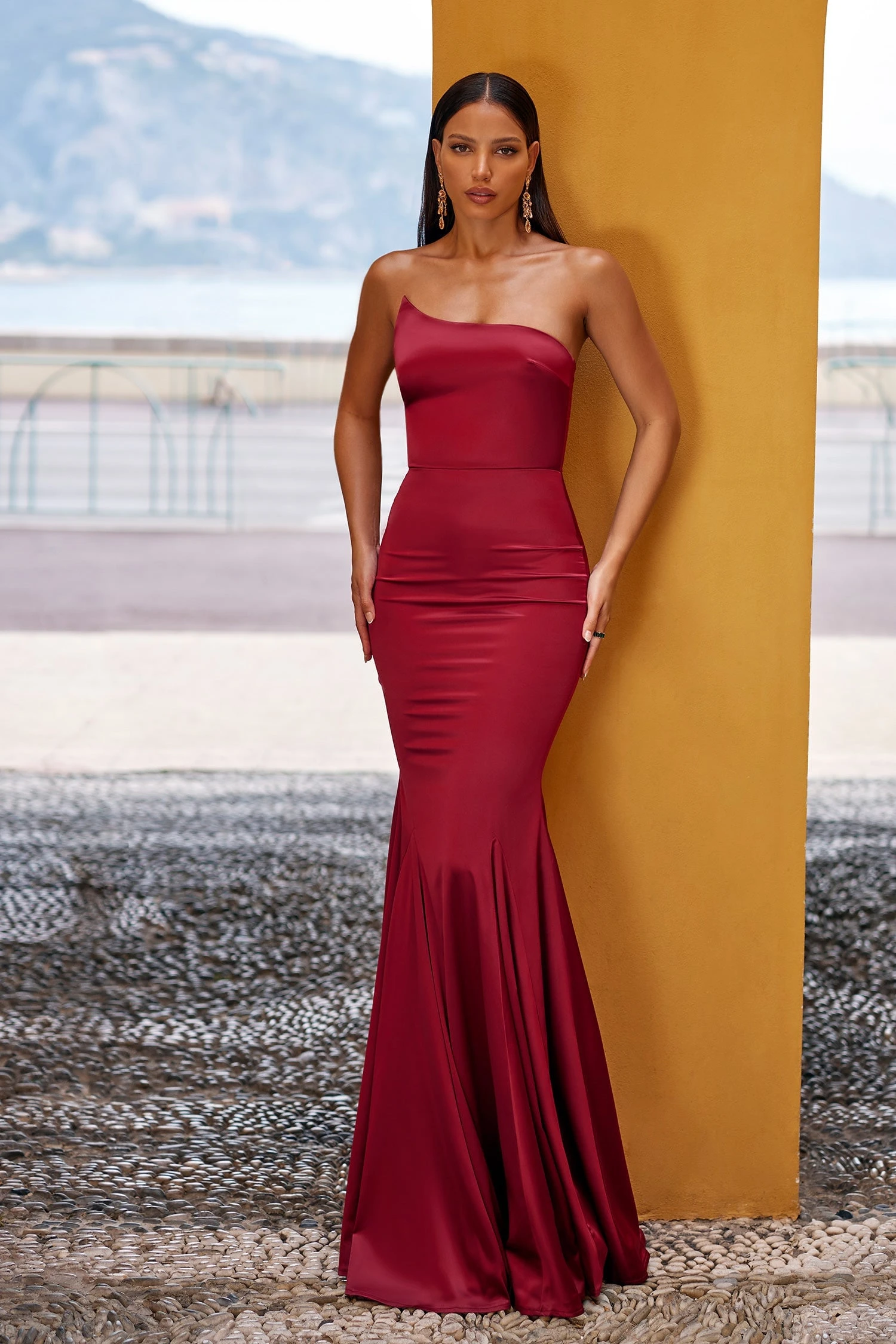 Simplistic yet stylish, the Leona Gown proves that less is more. Created in a burgundy-toned satin fabric and elevated by its unique neckline & fitted silhouette. Invest in timeless sophistication with the Leona Gown.