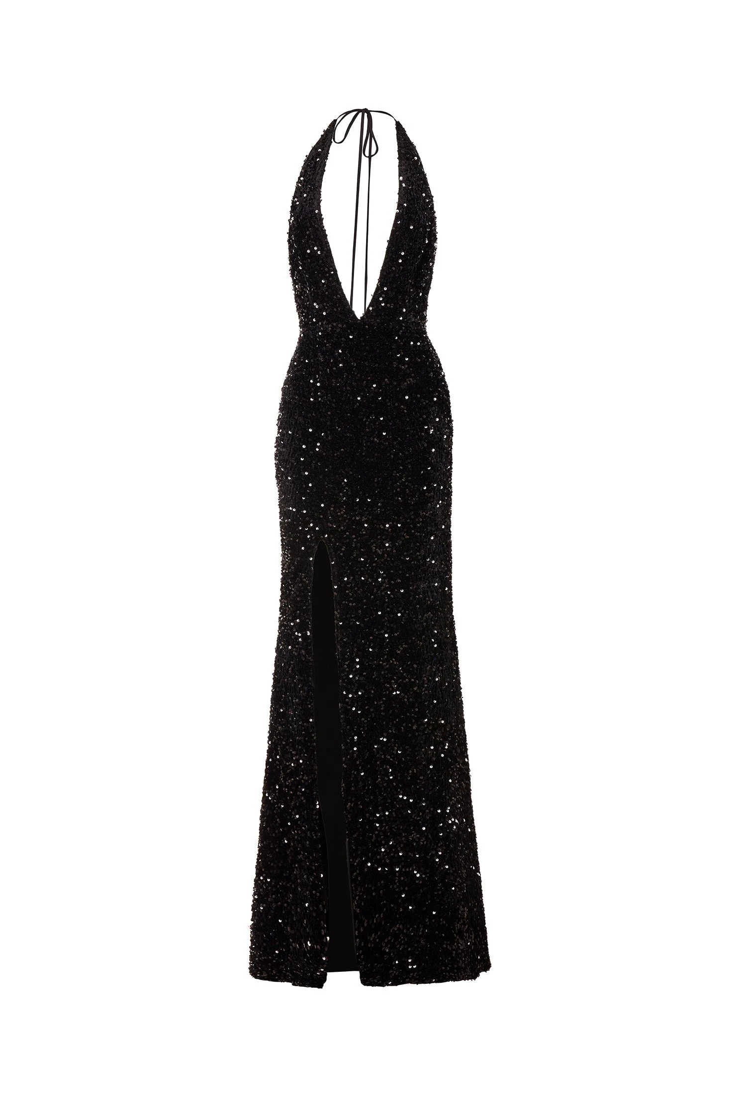 The Lili Gown offers a modern take on evening styling with its plunge neckline, waist wrap straps and thigh-high slit. Fitted at the waist and falling to a straight silhouette, this black velvet sequin fabric will elevate your formal attire.