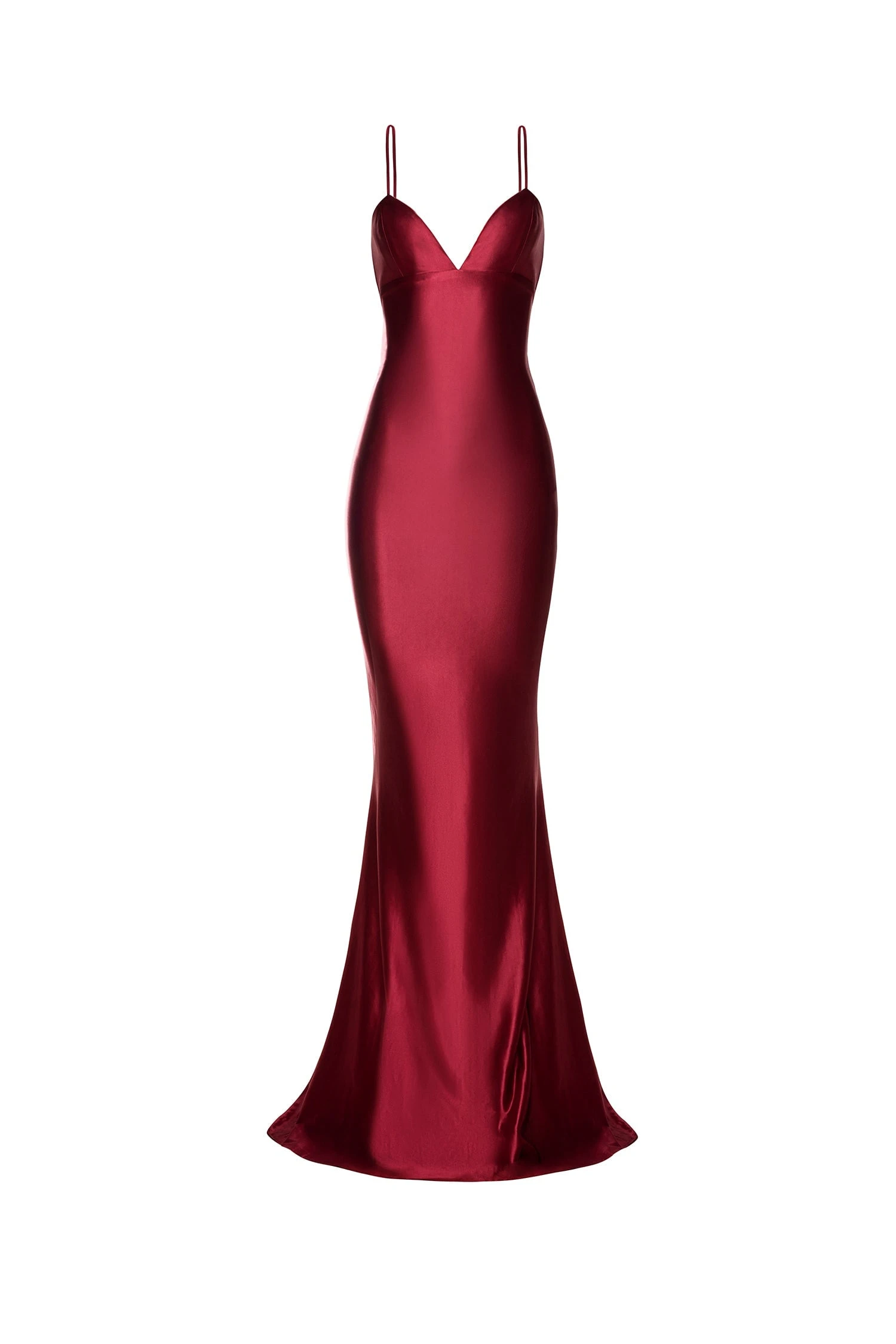 The Maisie Gown is a style that will stay on trend. Rendered from a burgundy-toned thick satin fabric that hugs the figure in all the right places. This gown features a v-shaped bust, a lace-up back, and a mermaid silhouette.Â