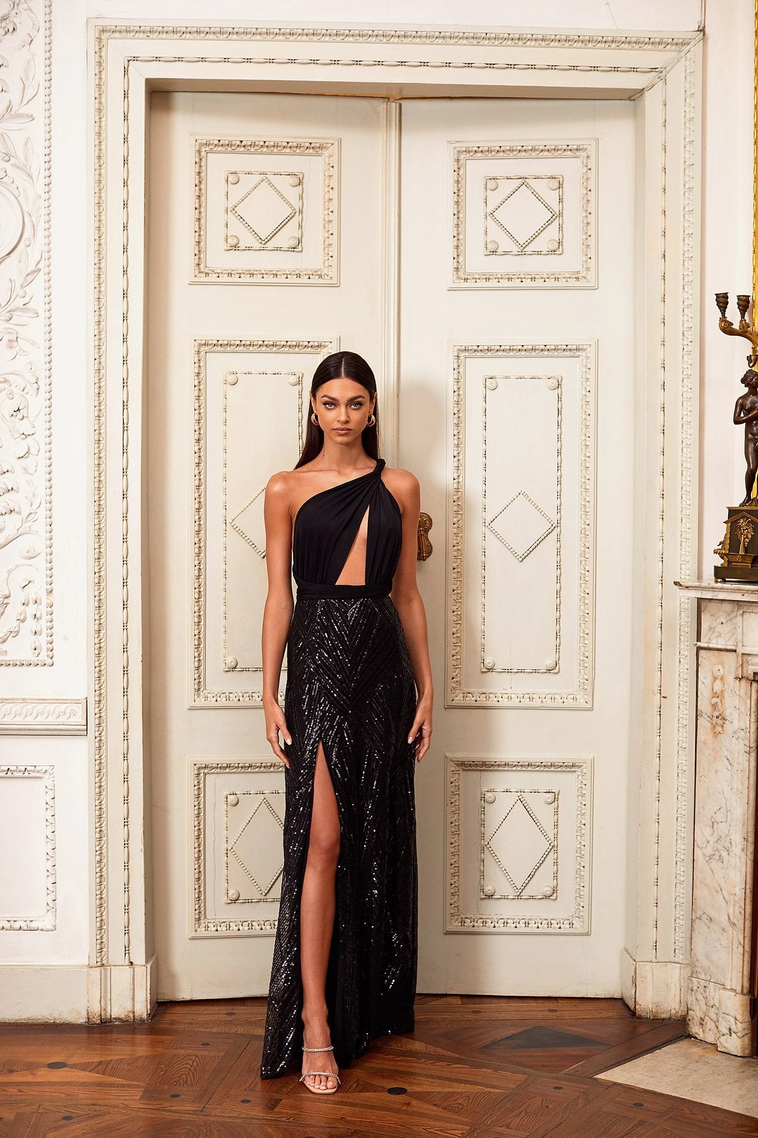 Super stretchy top half jersey slinky fabric (double-lined, lightweight fabric), Multiway top, Floor-length, Slight stretch in the skirt fabric, Skirt fabric is sequins, Right leg side slit.