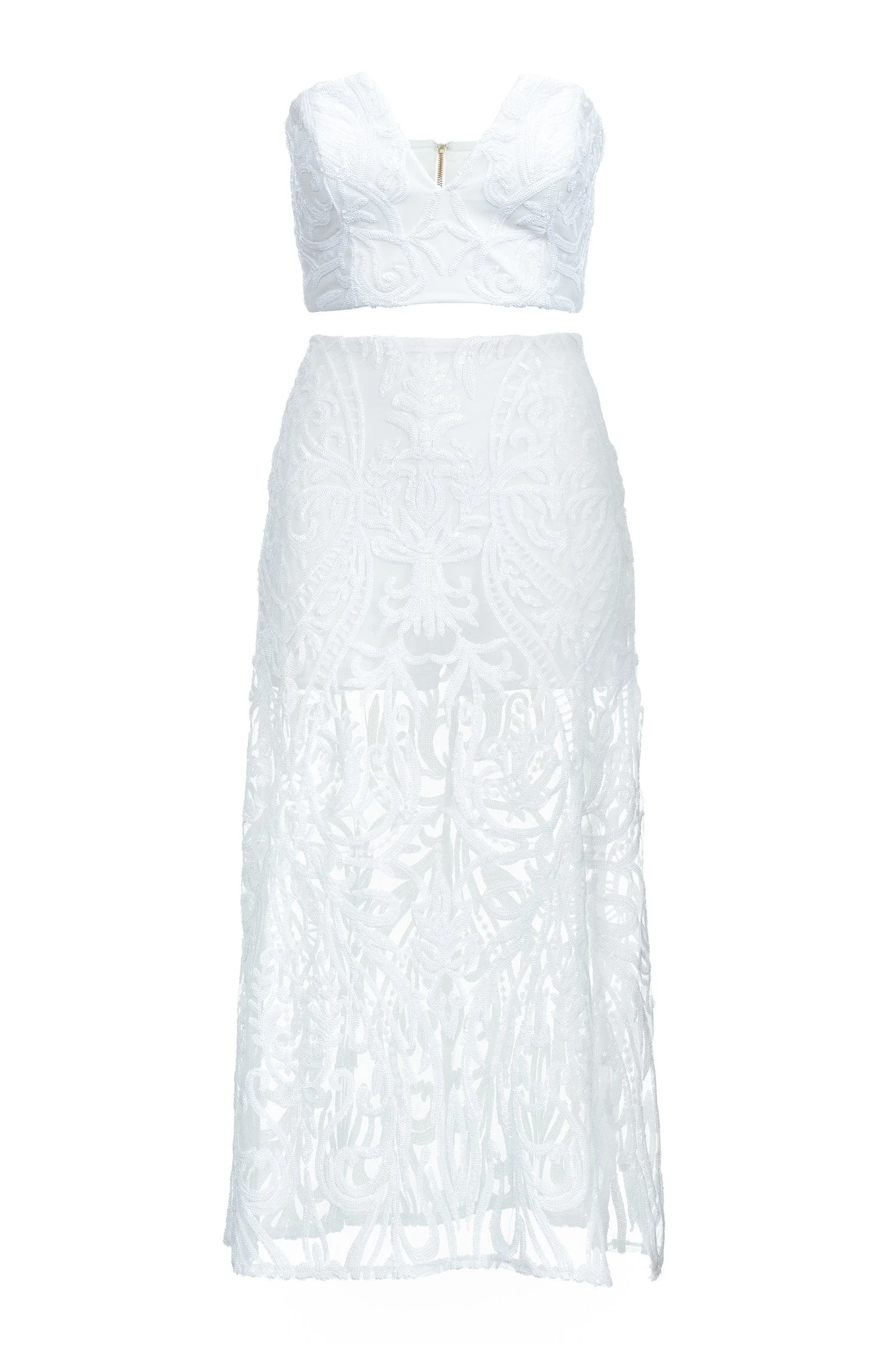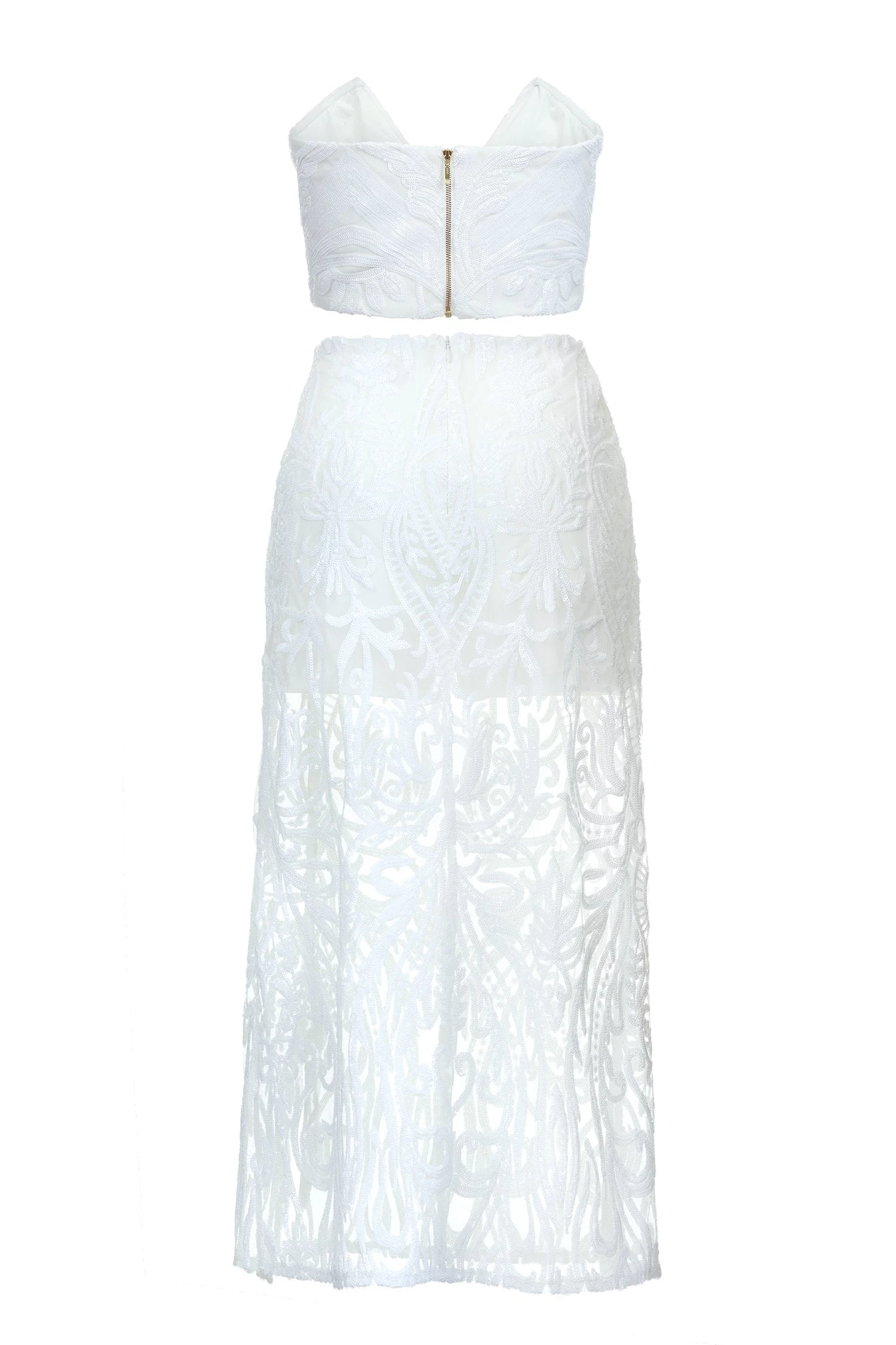 Dance the night away in the Mauris Set. Made from white sequin fabric & features a cropped strapless v-neck bustier with a matching semi-sheer midi skirt. So glamorous.