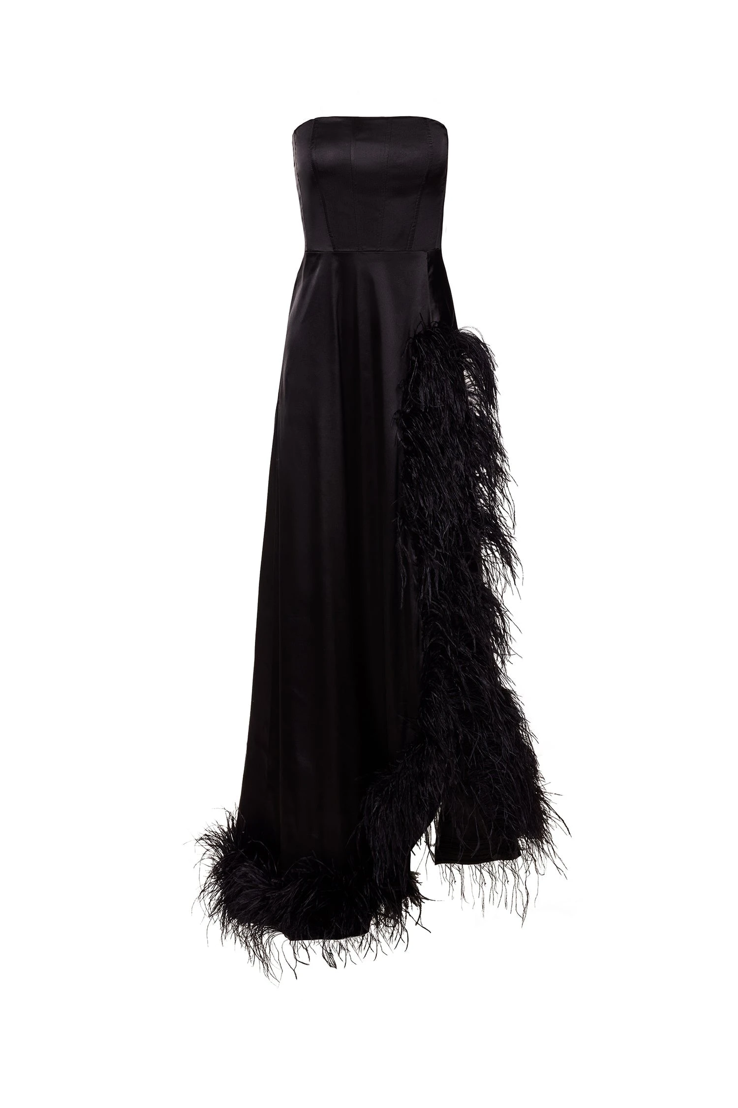 The Scarlett Gown emulates luxury with each detail. This style is formed with a strapless neckline and a statement feather trim. The classic black satin fabrication provides an essence of class to your evening edit.